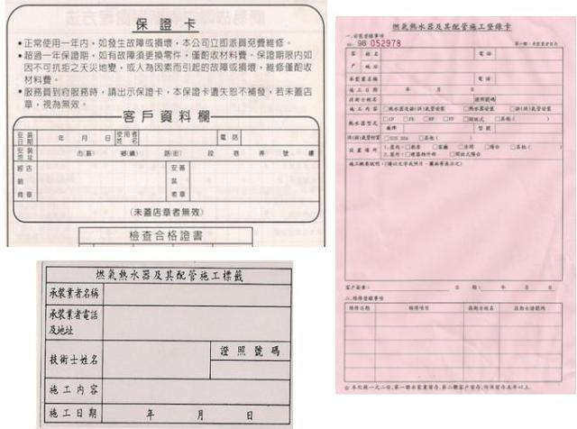 依消防法第15條之1重點技術士執業規定第12條。民國95年2月1日起實施,熱水器承裝業(僱用技術士)須於熱水器安裝設完成之後確實填寫相關資料,並保留5年以上為保障消費者權益。